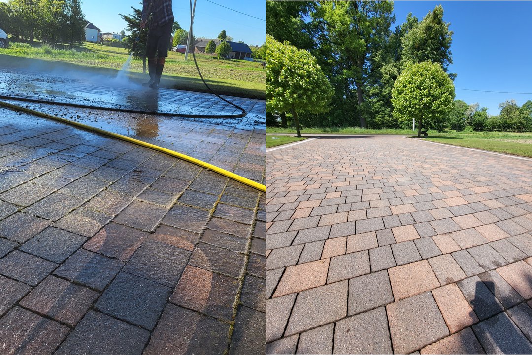 Mycie ciśnieniowe kostki w parku miejskim w Chybiu.
